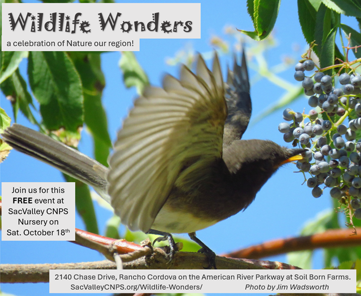 The Sacramento Valley Chapter of the California Native Plant Society (SVCNPS) will be hosting Wildlife Wonders on Saturday, October 18, 2025 at the SVCNPS Nursery and Gardens located on the American River Parkway at Soil Born Farms. Wildlife Wonders is a free, family-friendly event celebrating the biodiversity of our region.